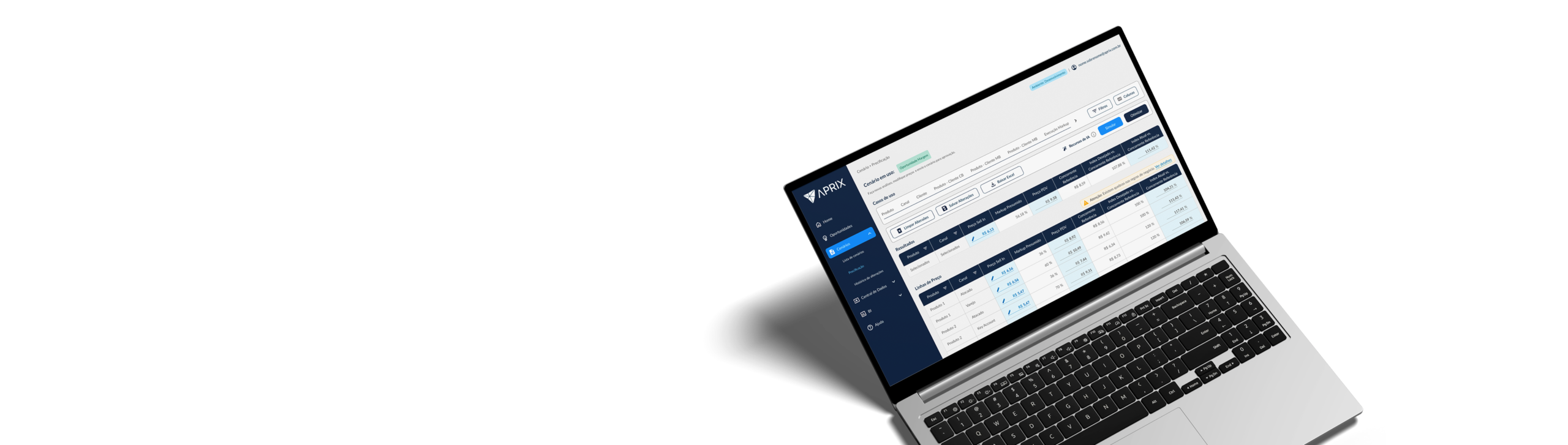 Antes, o processo era totalmente manual no Excel: lento, com baixa governança e alto risco de erros. Com a Aprix o processo tem mais agilidade, maior clareza nos impactos, melhora na gestão de múltiplas tabelas de preços, personalização das estratégias e aumento da assertividade do preço ideal.”